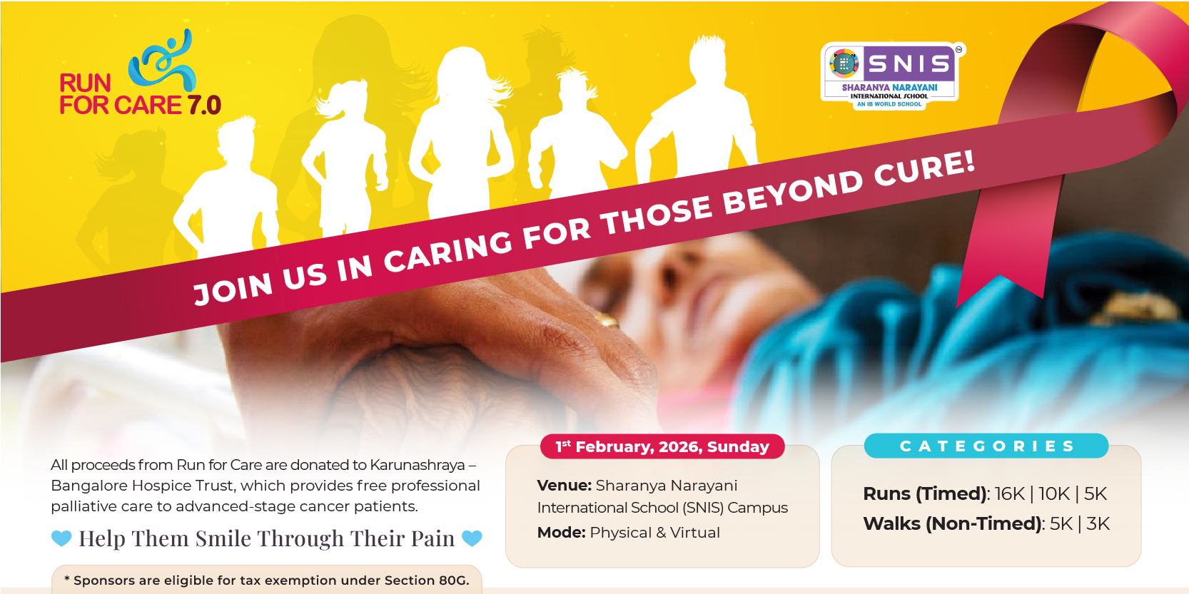 Sharanya Narayani International School (SNIS) proudly presents the 7th Edition of the Run for Care Marathon – a virtual and in-person run/walk dedicated to supporting Karunashraya – Bangalore Hospice Trust, which provides free, professional palliative care to advanced-stage cancer patients who are beyond cure.